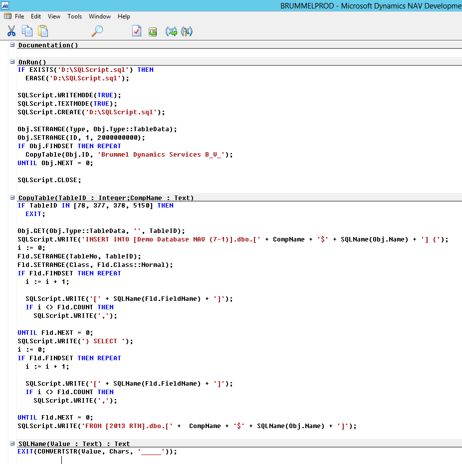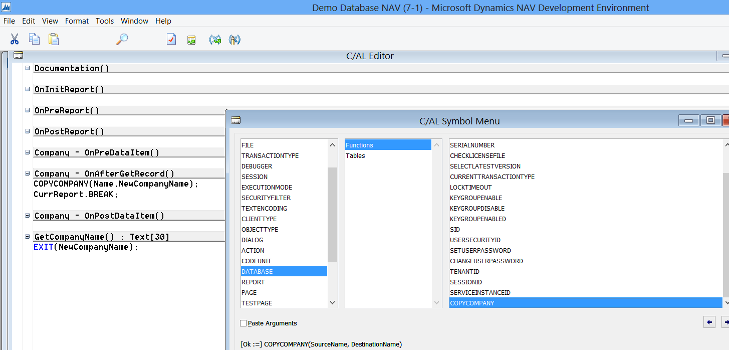 If you investigate the code you’ll see that Microsoft has added a new C/AL command to copy companies. COPYCOMPANY