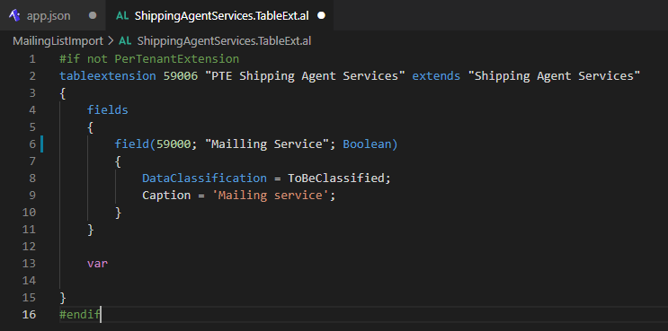 The next thing you do is to add exception code to duplicate objects. Whenever you need a table extension or a page extension in a module, add it in two places and use this in the module folder