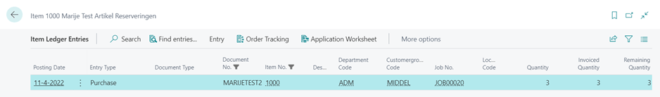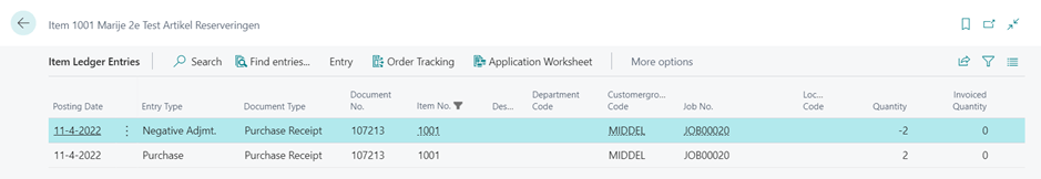 When you do that and put some values in these fields and post a purchase you will see that you’ll get an Item Ledger Entry with the Job No. populated WITHOUT the negative correction.