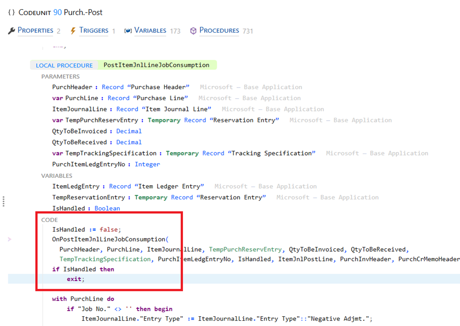 [EventSubscriber(ObjectType::Codeunit, Codeunit::"Purch.-Post", 'OnPostItemJnlLineJobConsumption', '', false, false)]