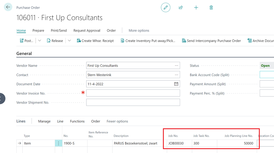 When you create a Purchase Order for an Item, Business Central allows you to populate the Job No., Job Task Code and Job Planning Line No.